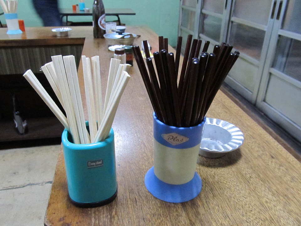いつの頃からか割り箸が登場するようになり、現在は両方置いてある。