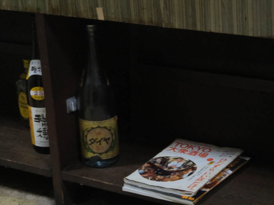 カウンターの内側、カネスが掲載されたと思しき雑誌の横に、にダイヤの一升瓶を発見!