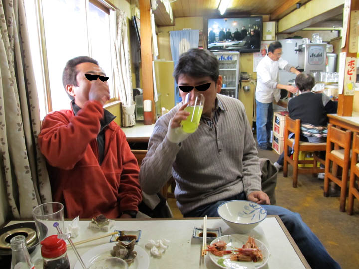 昼時の明るい日差しが差し込む窓辺で、まこちゃんとキムさん、いい塩梅ェに酔っぱらってグビリ。