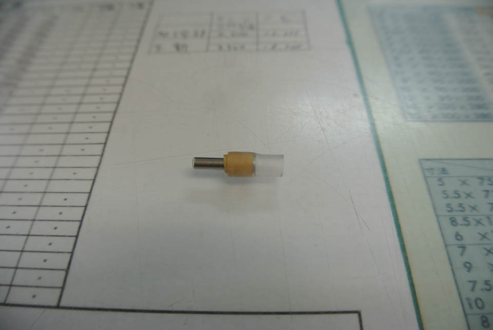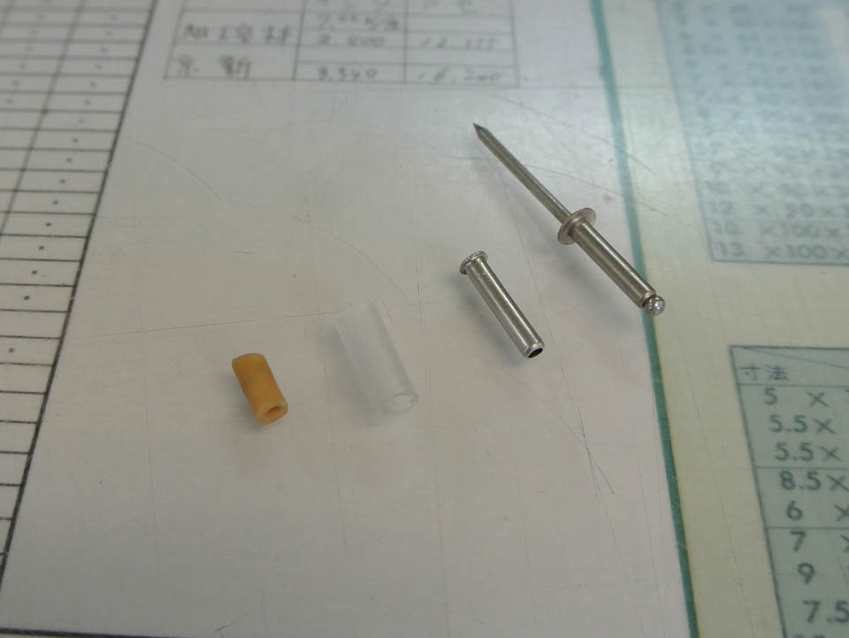 ジャンクボックスから拾ってきたΦ3mmのブラインドリベット(右端)の芯を抜き、フランジを削ってΦ4にしたのが右から2番目のヤツね。