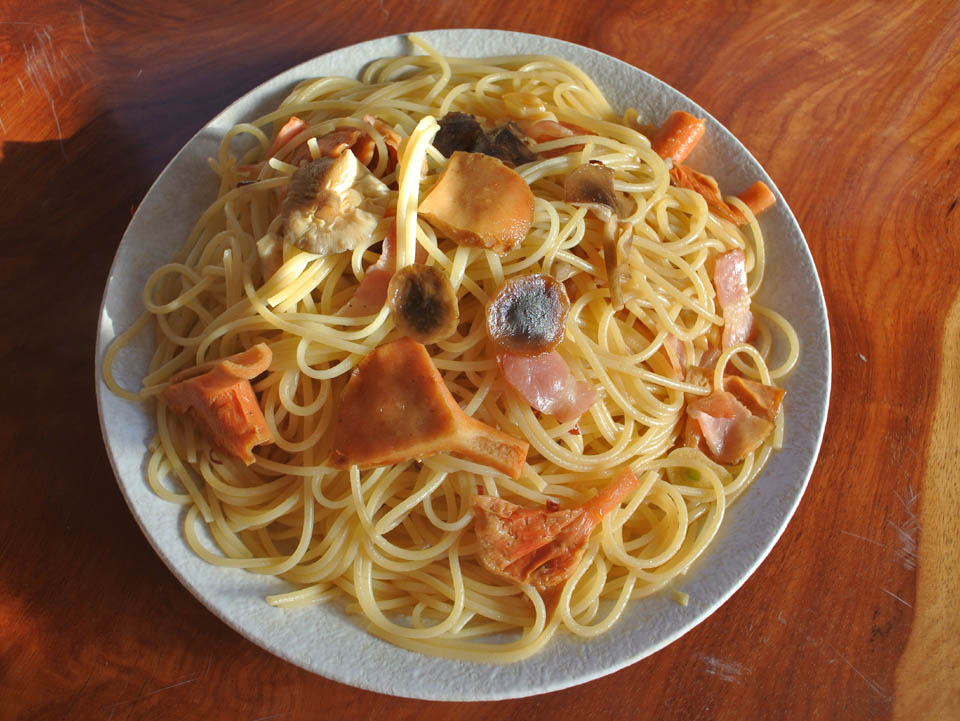 翌日の朝、ハタケシメジとアカモミタケのペペロンチーノ。