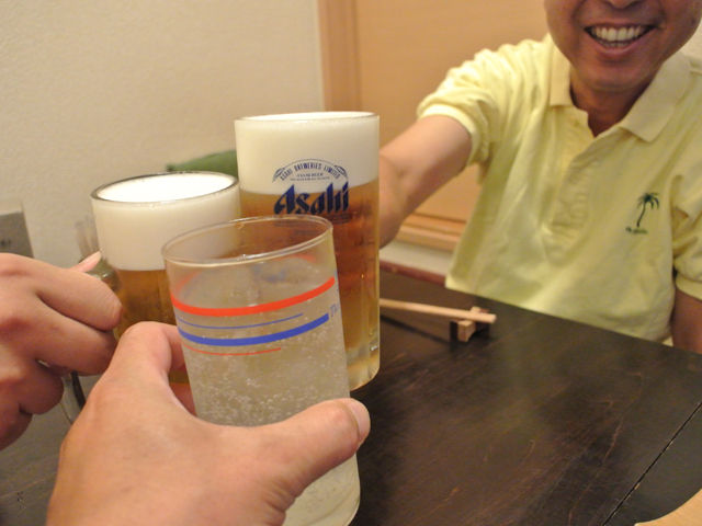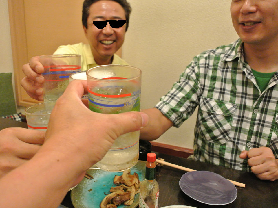 つーことで、僕とまこちゃん、それから某M山氏を交え、スタート乾杯~♪お二人は生ビールですが、僕は昼間食ったニオウシメジと鯖がまだお腹にいるので苦しくて(ワハハー)