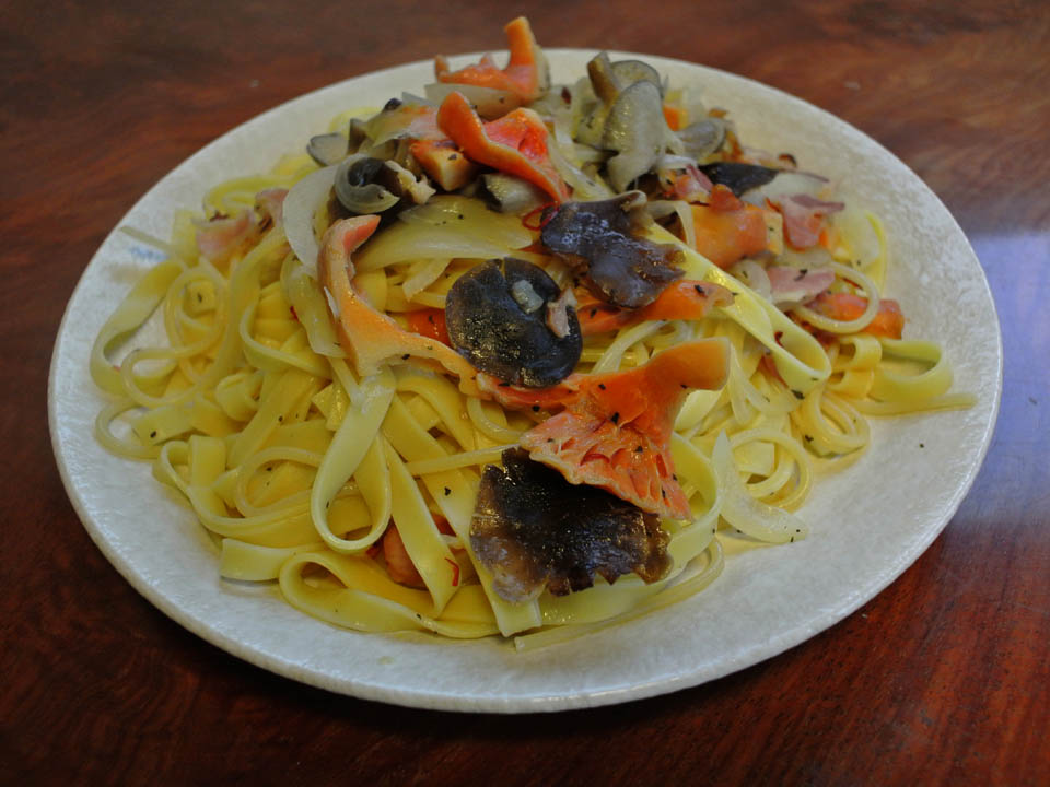 アカモミタケとハタケジメジのフィットチーネ アーリオ オーリオ ペペロンチーノ。