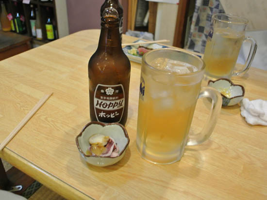僕もホッピーをもらって・・・・ お通しはホタテとイカのボイル酢味噌。