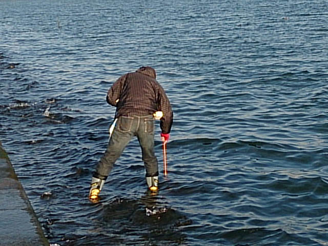 キムちゃん、沈みゴロタの上に乗って、根掛かり外し苦戦中・・・・