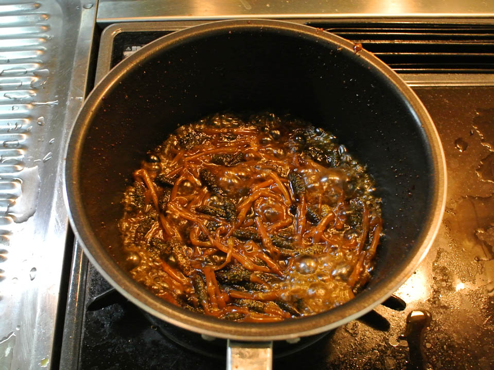 にんべんのつゆ・酒・みりん・砂糖・鰹ダシの素・仕上げに水飴で煮詰めて・・・・