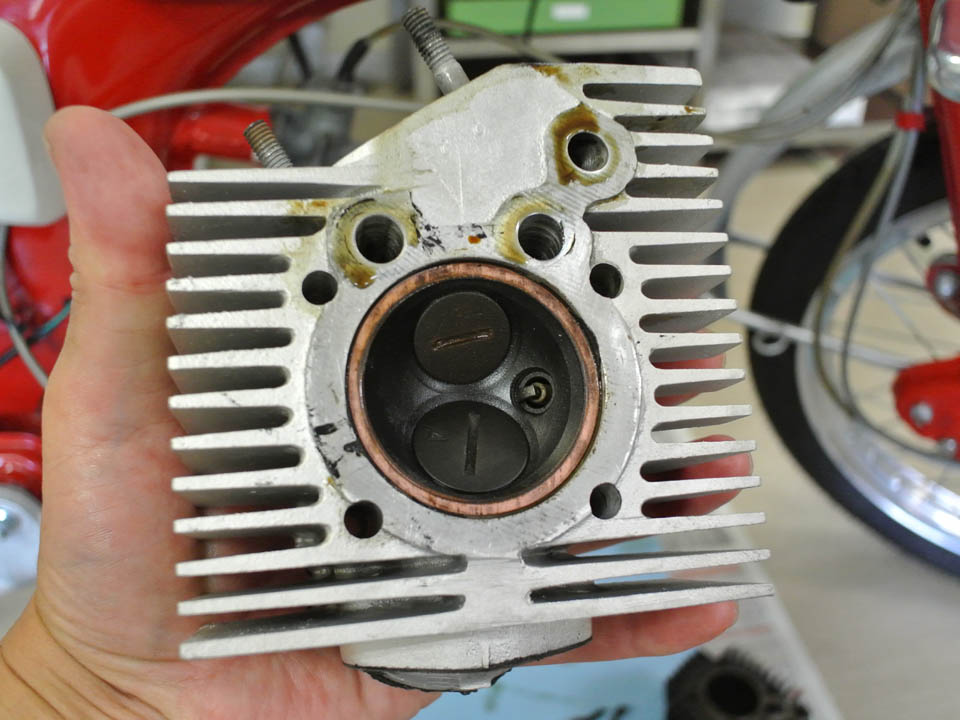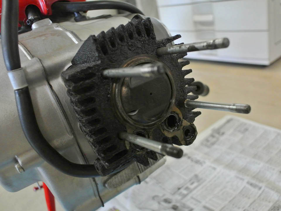 まずはヘッドを剥ぐって見ると、若干オイルっ気で湿っぽいが、燃焼室のダメージは無い様子でひと安心。