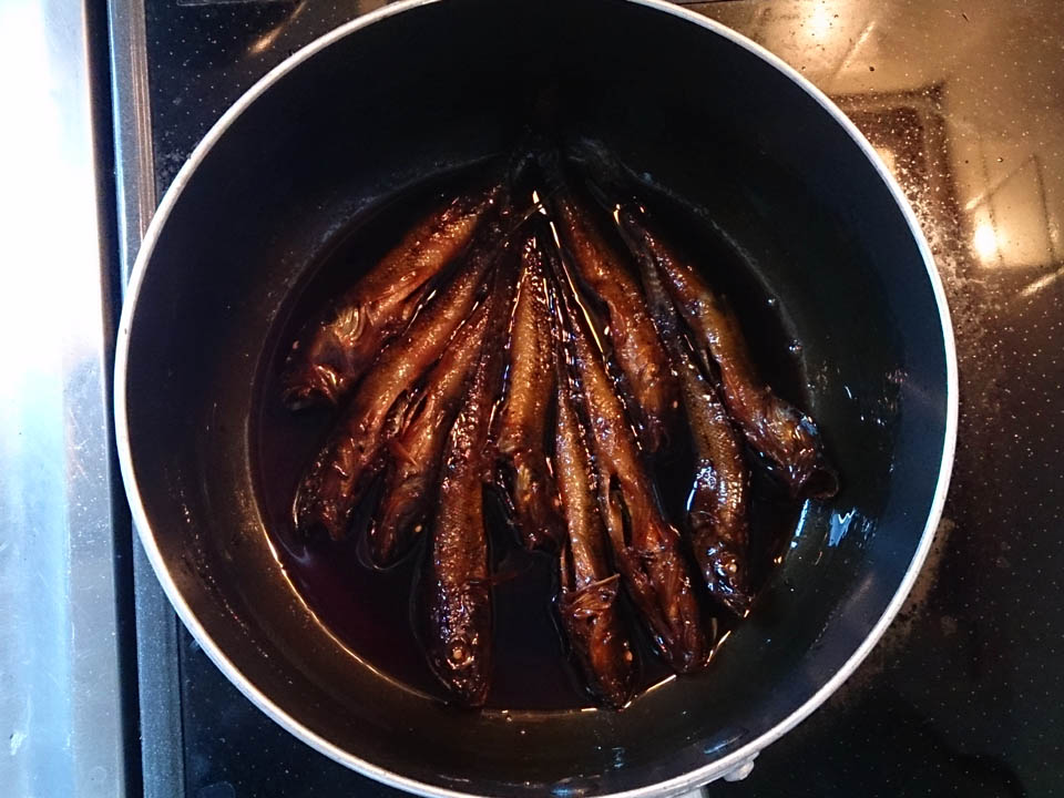 持ち帰った鯊を始末し、一晩夜風に晒したら、今朝、番茶でひと煮たちさせてから甘露煮。