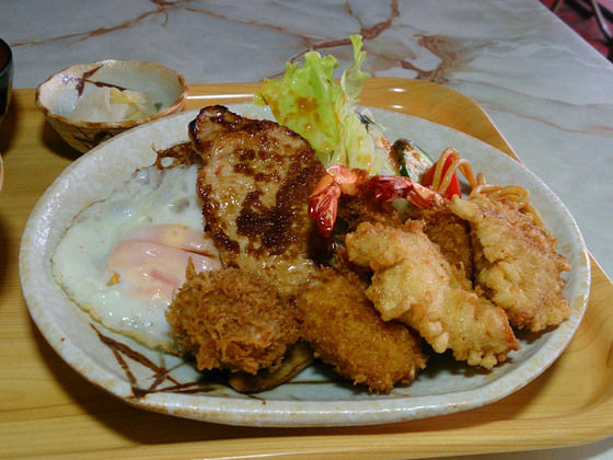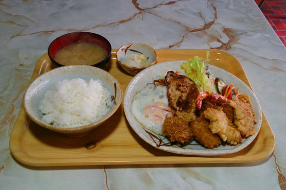 いわゆる一つのミックスフライ定食なんだけど、鳥唐揚げやら豚生姜焼きに目玉焼きまで乗って、デラックス♪