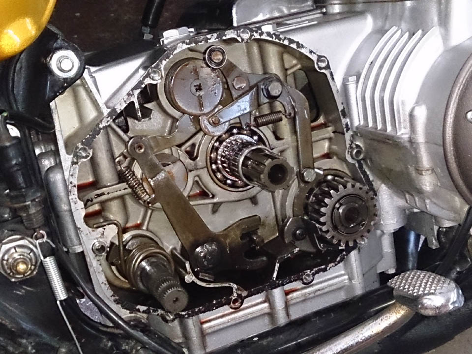 シフトリンケージ関係を外した状態でシフトドラムを回してみるが、おかしな抵抗も無く、不具合は見当たらず、リンケージを復旧しても、動きはごく普通・・・・