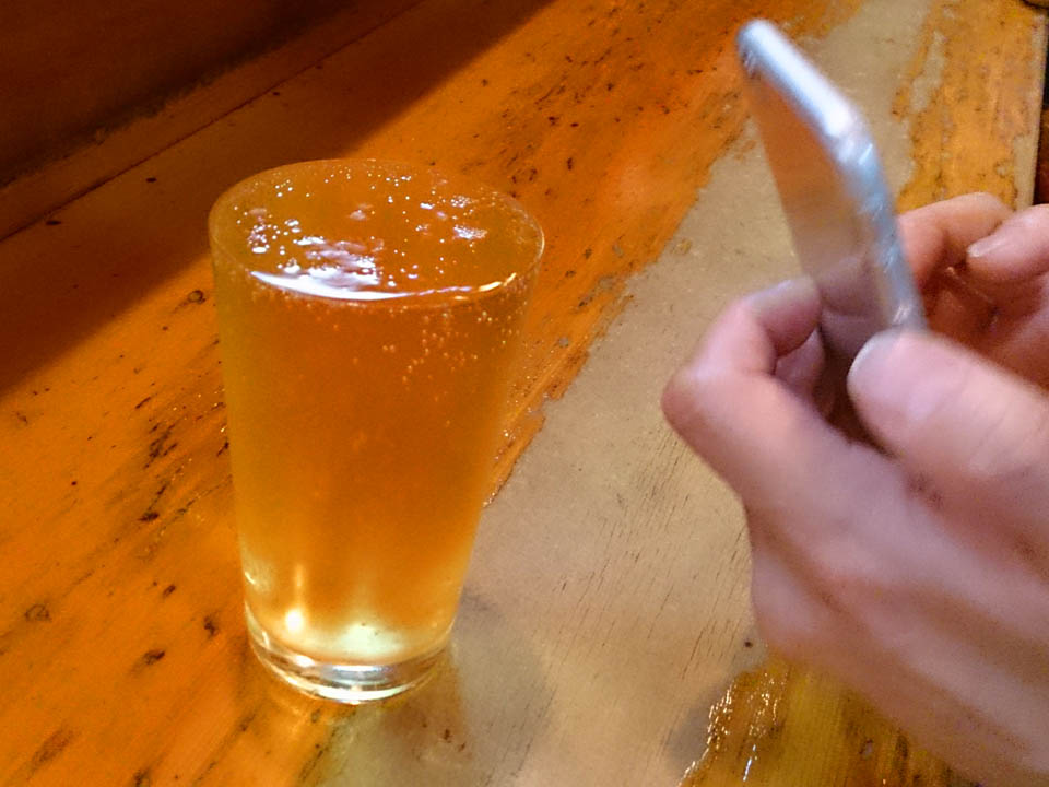 ここのハイボール、モッキリで注いでくれるので、口から迎えに行く式。