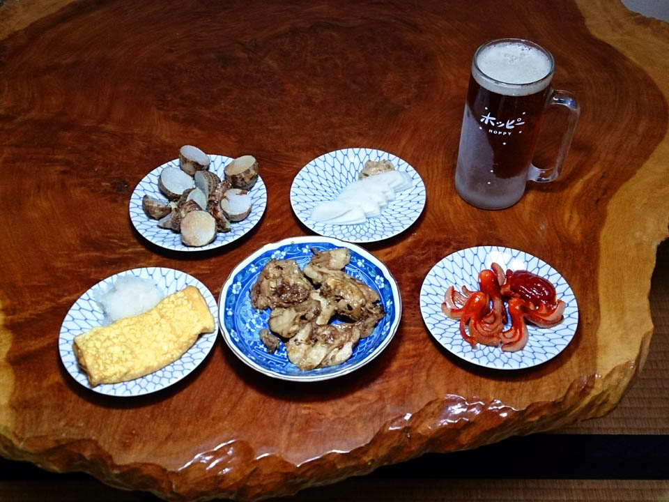 このところ凝っている自家製卵焼き・きぬかつぎ・板わさ・たこウインナー・ホウキタケのソテーでちょっちゅるデラックス。