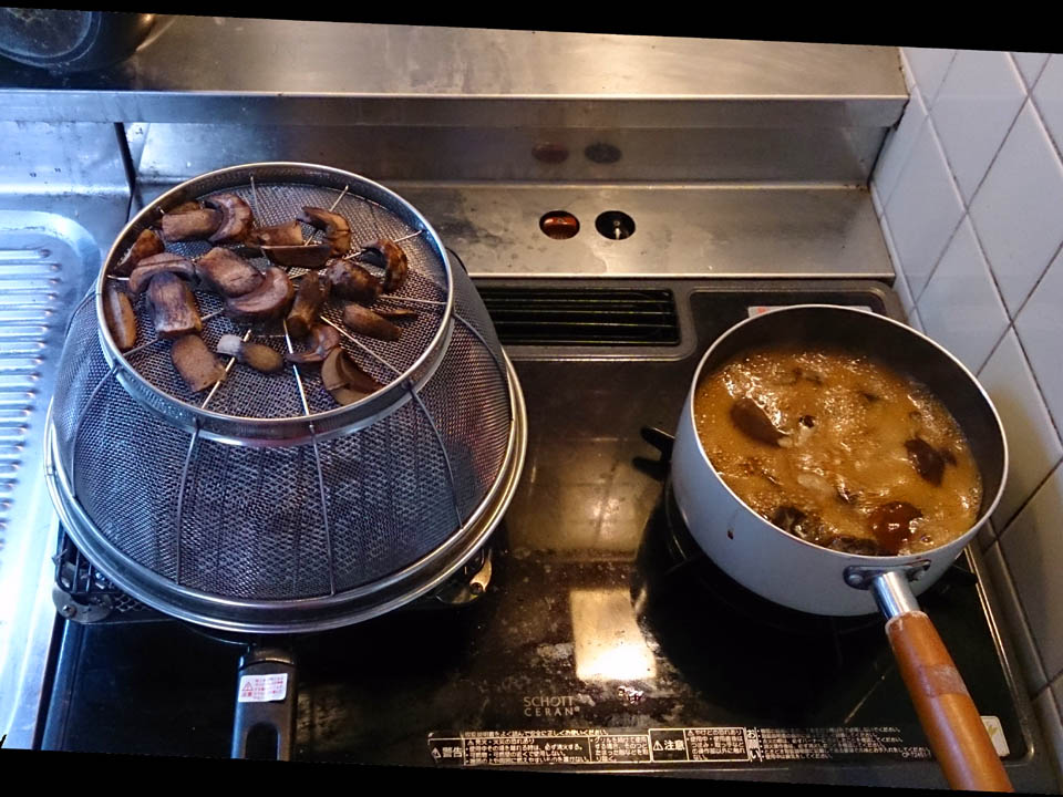 ナラタケは雨降りだったので水を吸っており、醤油みりん砂糖を入れただけでもこんなにおつゆが出る。