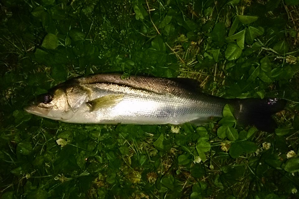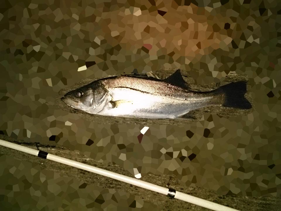 イソメ仕掛けに1~2度触るような当たりの後、2:45、30センチ弱のセイゴ。