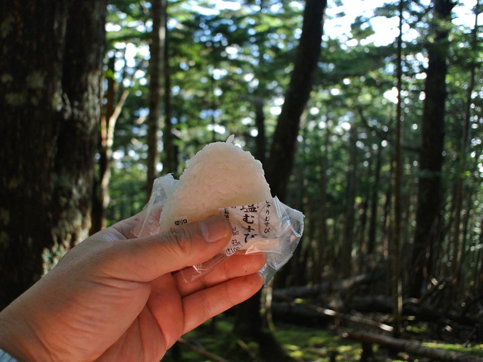 乾いた倒木を見つけて腰掛け、おにぎり朝食。