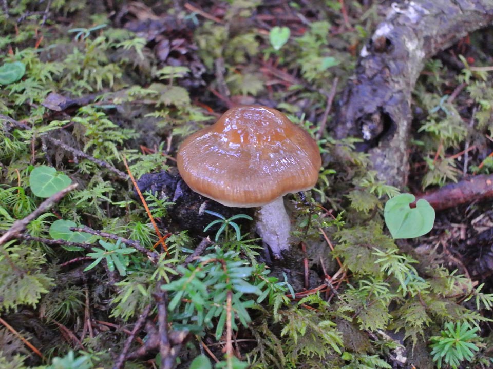 傾斜がきつい尾根筋を避け、左側斜面を斜めに上がって行くと、ヌメリササタケが端正な姿で。