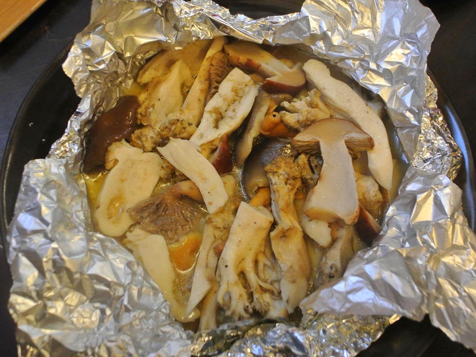 ツガタケ・ホウキタケ・タマゴタケ・ヌメリササタケ・アンズタケのバター焼き。