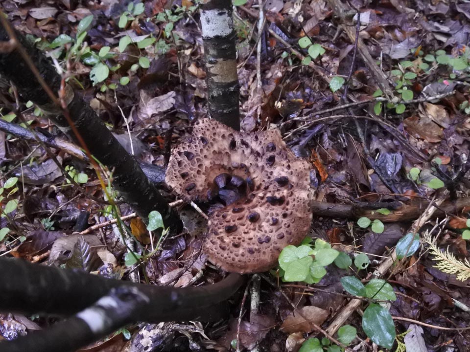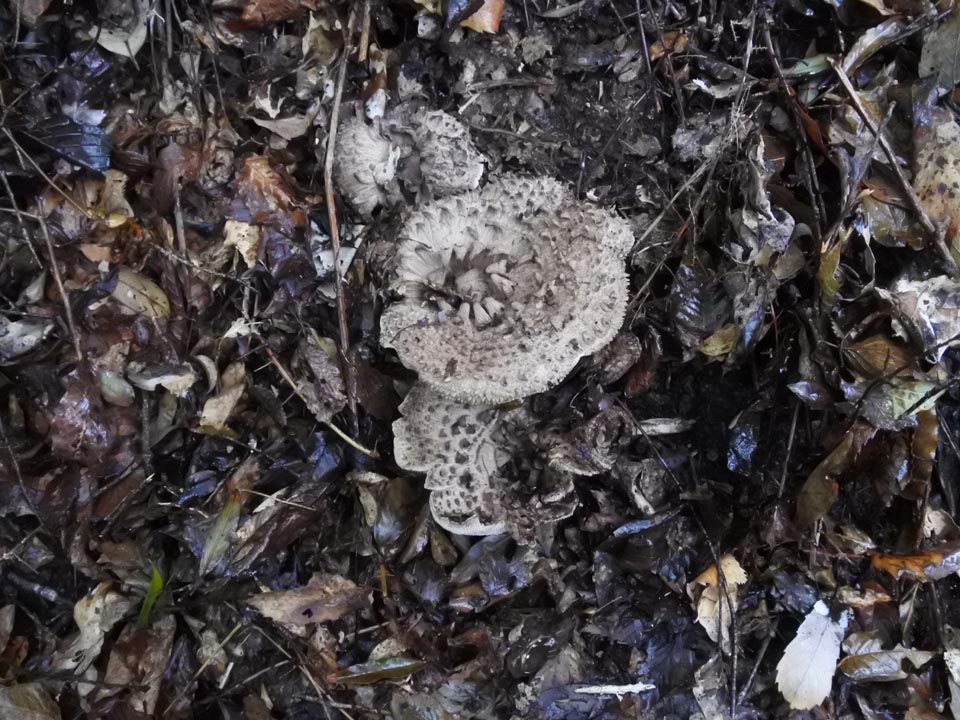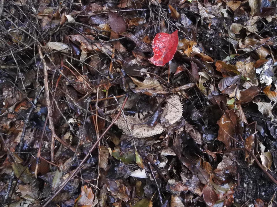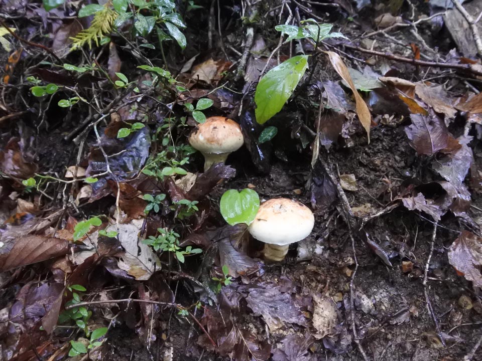 見慣れた針葉樹のマッチャンと違い、広葉樹のリターに紛れたバカマツタケは見つけにくい。