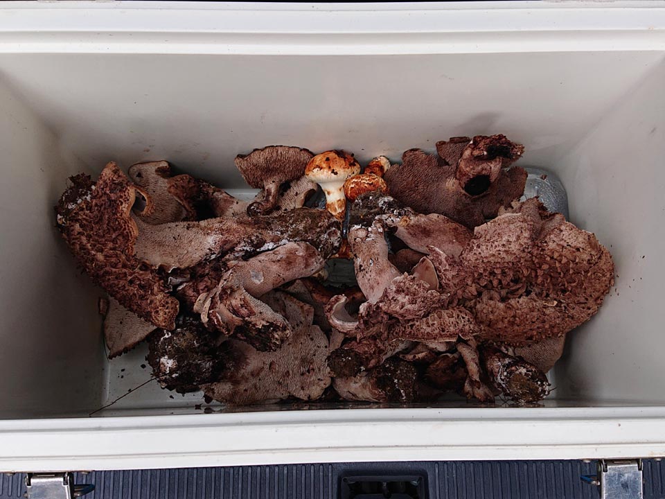 このシロだけで腰籠一杯のコウタケ。