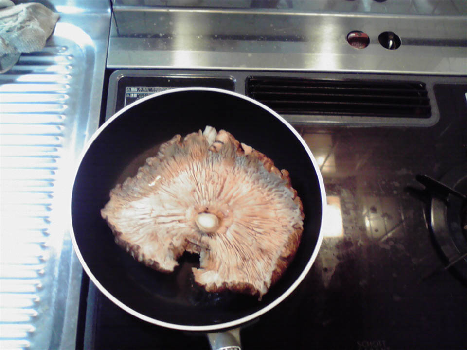 ぎりぎりフライパンに収まる大きさまで完全に開ききったシイタケつーのは、一般の市販品とは見た目もかなり違い、知らない人はシイタケに見えないかも。