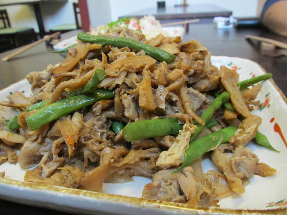 ホウキタケと豚肉とインゲンと油揚げの炒め煮マイウ~