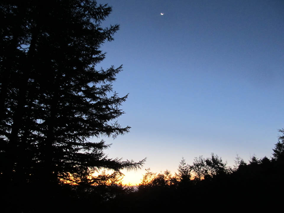 朝焼けに滲む三日月。