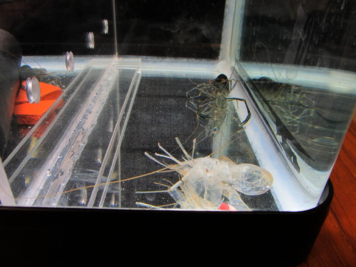 手長蝦にとって最大のピンチは脱皮であり、皮を脱ぎ棄てた直後の柔らかい体では自由に動き回る事もままならず、他の蝦からの攻撃に対しても全くの無防備。