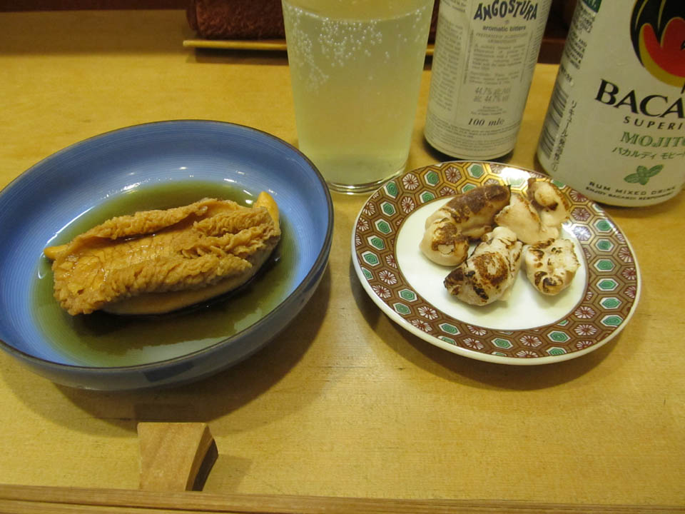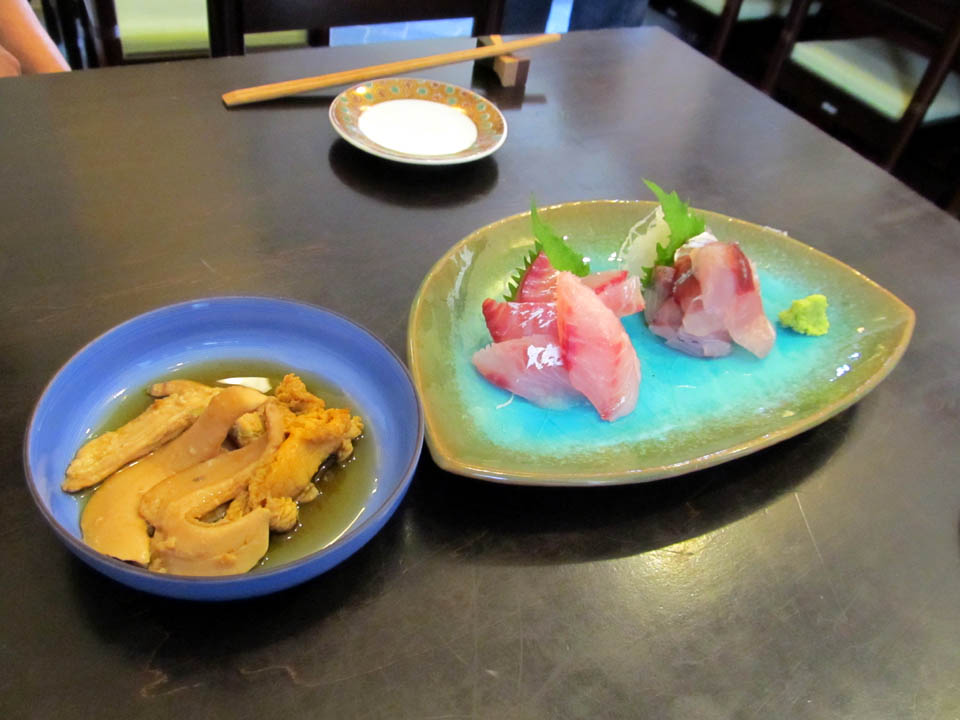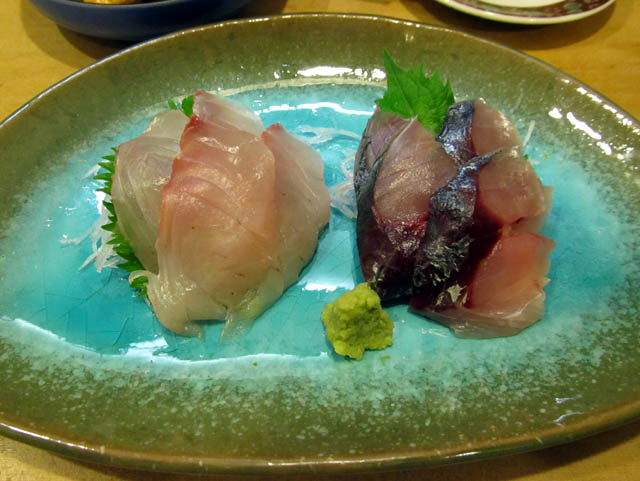 付き出しは鯵と鯛の刺身。