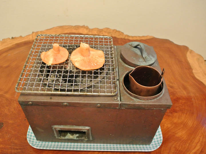 炭を熾して熱湯を注ぎ、高清水をチロリに注いだらアカモミタケを乗っけてスタート。
