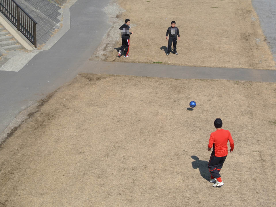 親子でボール蹴りに興じる、正しい休日の微笑ましい風景。 あれ?良く見ると・・・・