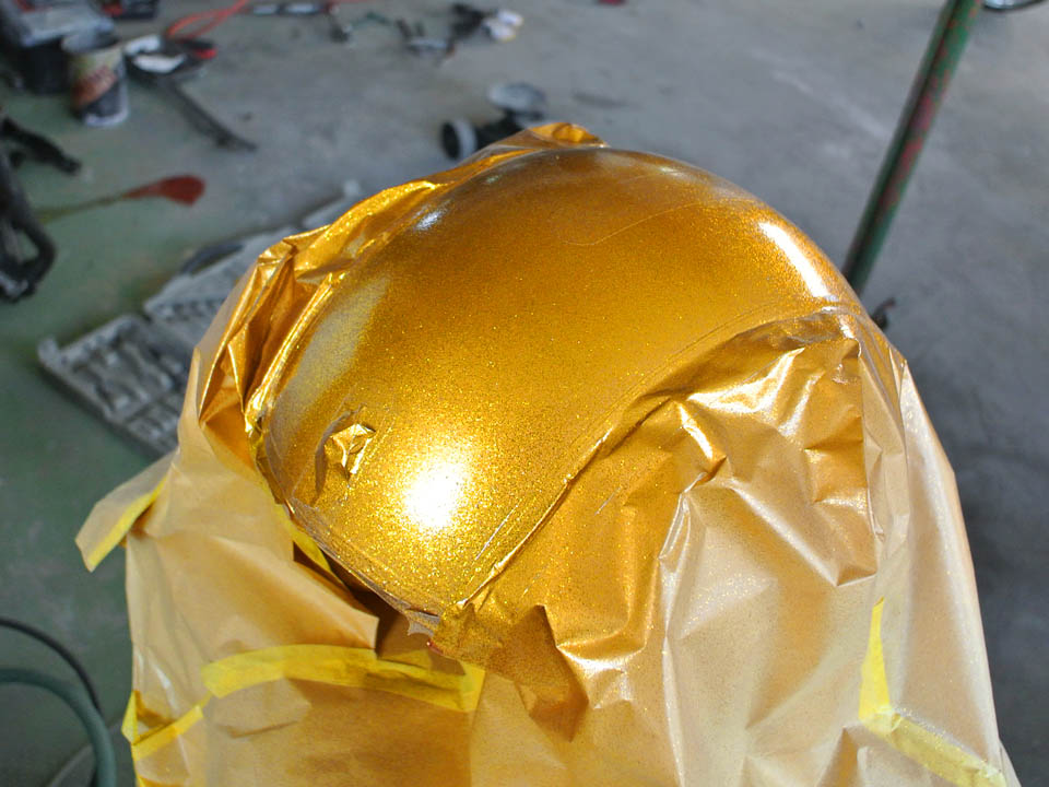 今回はキャンディー塗装にするので、まずはゴールドラメを吹く。