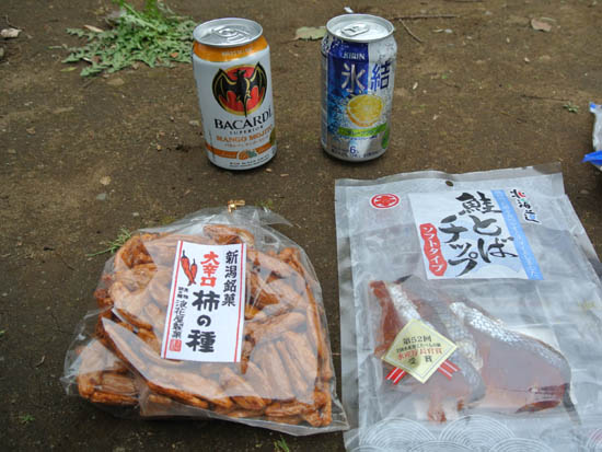 地元の重鎮文殊菩薩さんから以前頂いた新潟土産のカキの種と、以前まこちゃんから頂いた鮭とばだ。