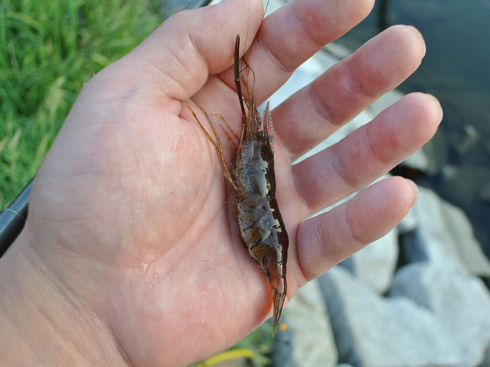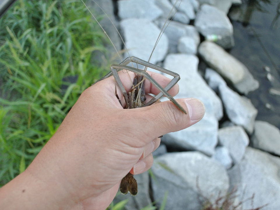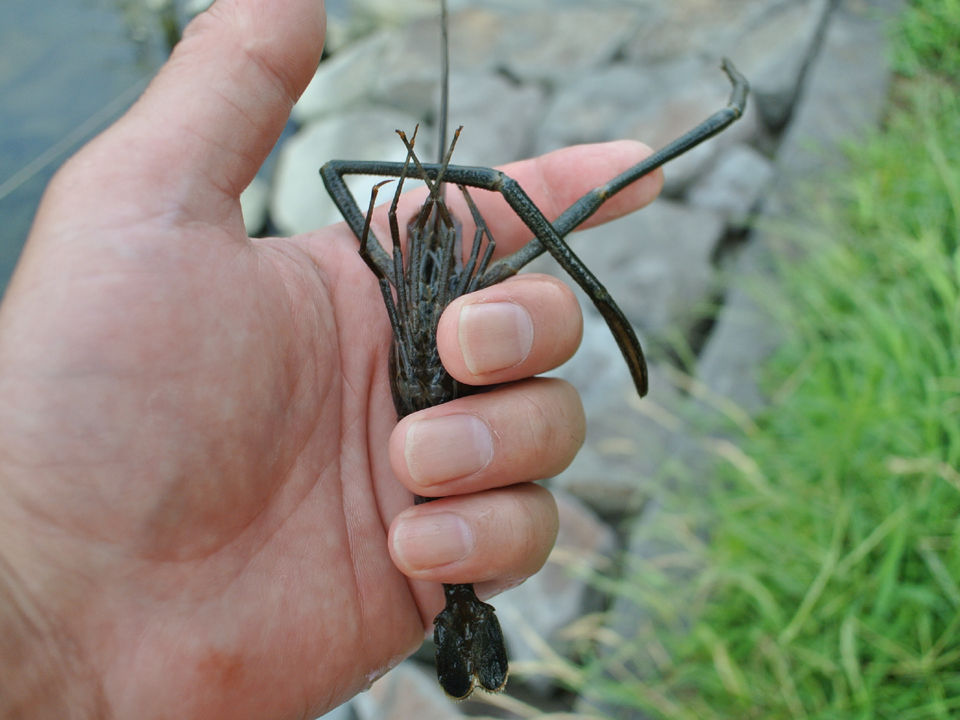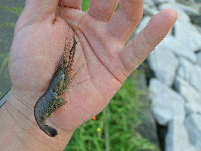 そんな中、」ぼんやり川面を見てたら、セイゴに追われてエビバックで逃げ惑う小さな手長蝦を目撃。