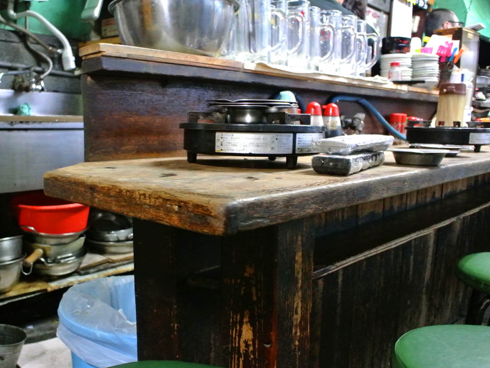 うなぎの寝床的レイアウトの店内、長いカウンターの奥に小上がりがあり、その手前まで四人がけのテーブル席が幾つか。