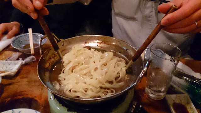 肝たっぷりのおつゆに割り下をさして、〆のきしめん投入~♪