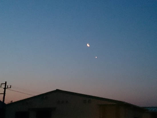 未明の月。 横にあるのは金星かな? あっ、明けの明星ってヤツだなきっと。