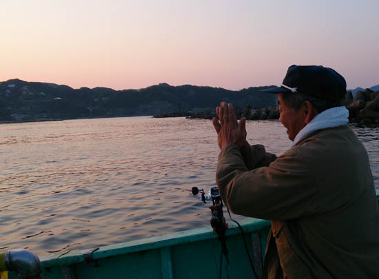 お天道様に大漁祈願するK山師匠。