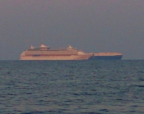 遥か沖には豪華客船が見える。