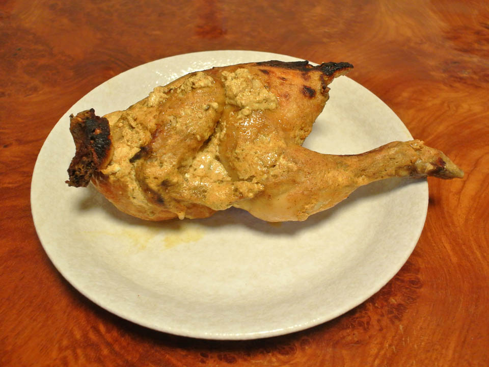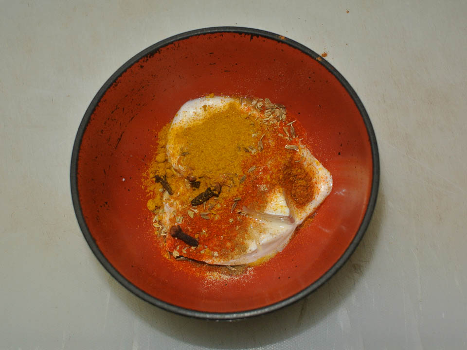 で、ヨーグルトとスパイスを充分にこねくり回したら、鶏の素揚げに塗ったくり、オーブンで焼くだけ。