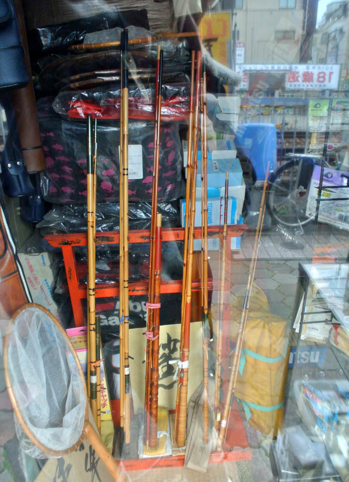 鯊の穴釣り用に、一番右の短かい手バネ中通し竿を見せてもらいます。