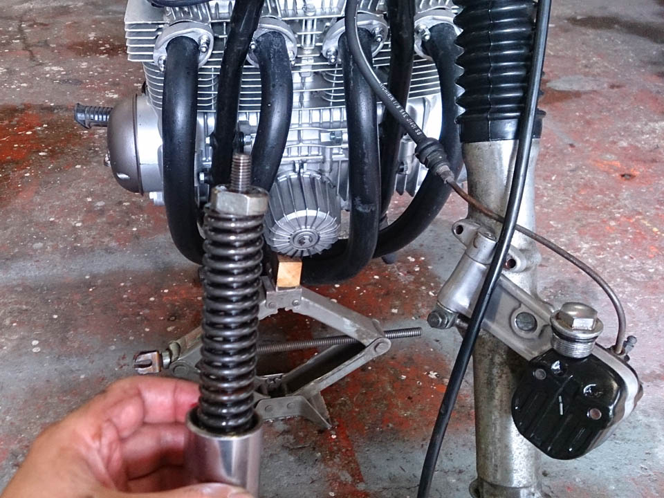 まずは前輪とフェンダーを外すと、先週修復済の左に対し、自由長はあからさまに右が長い。