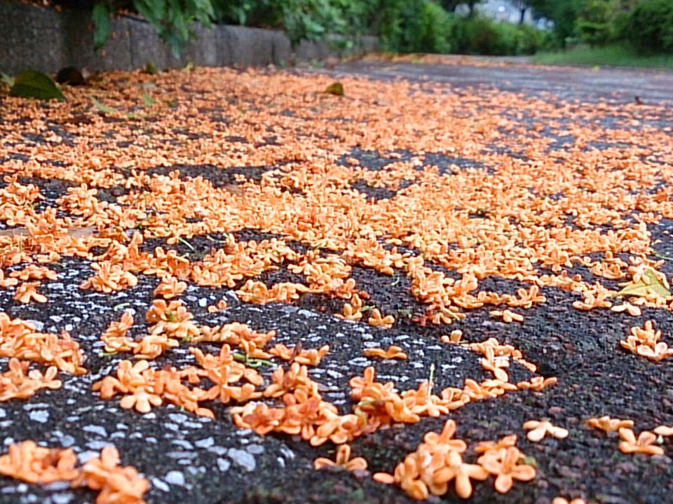 仕事で駅に向かう途中、街路樹の金木犀の花が散っていた。