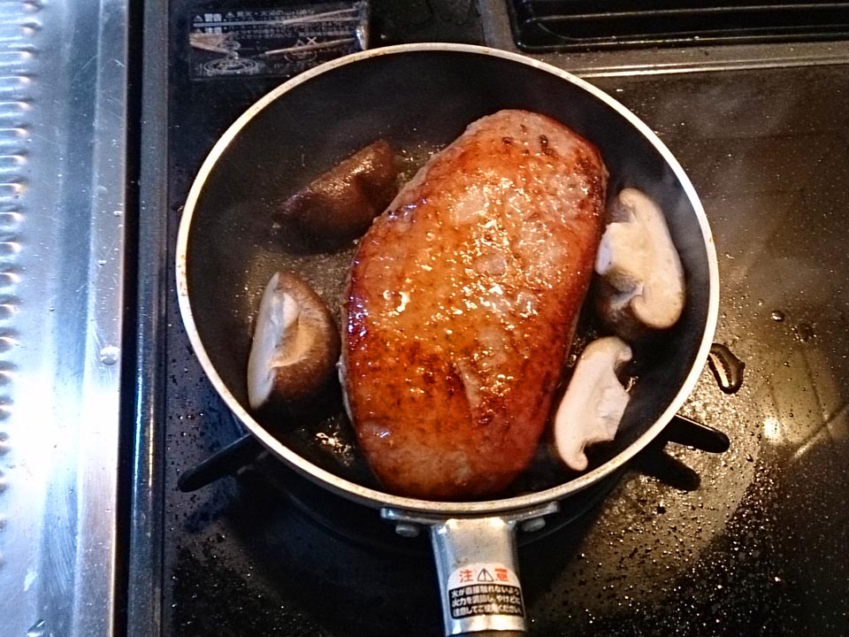 年末の餅つきの時に持ち寄ったマグレカナールをソテー中の図。