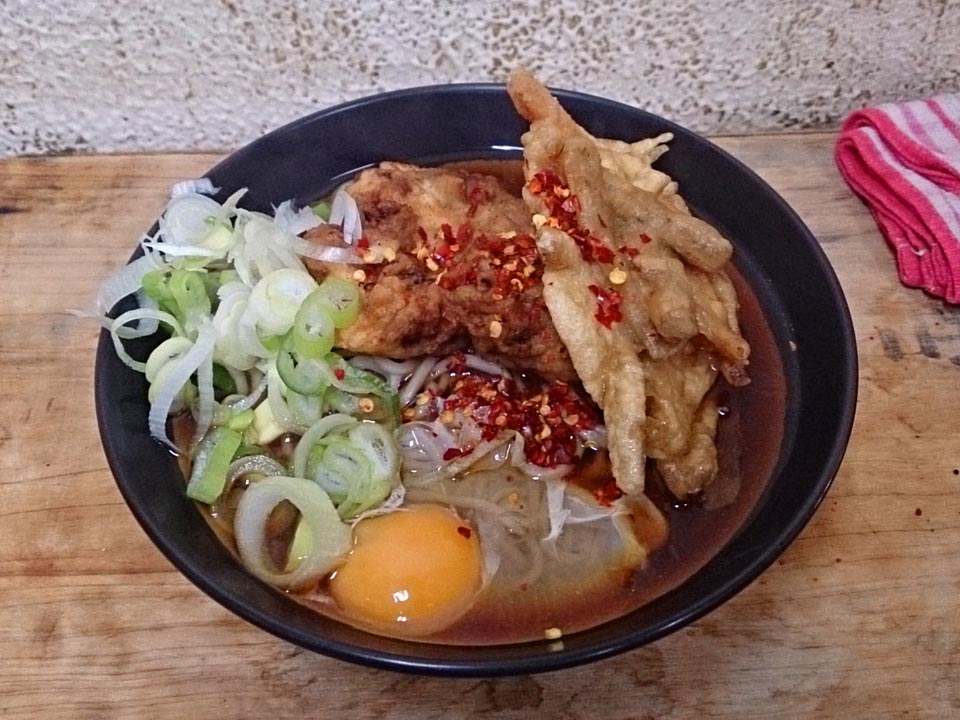 久々の六文そばにて、ゲソ・ゴボウ・生卵。