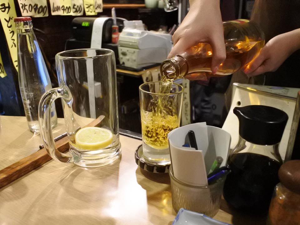 エキスプレミキシングの焼酎を炭酸で割るスタイルは中村屋に似てるけど、こちら大林は一先ず小さなグラスにサーブされる。