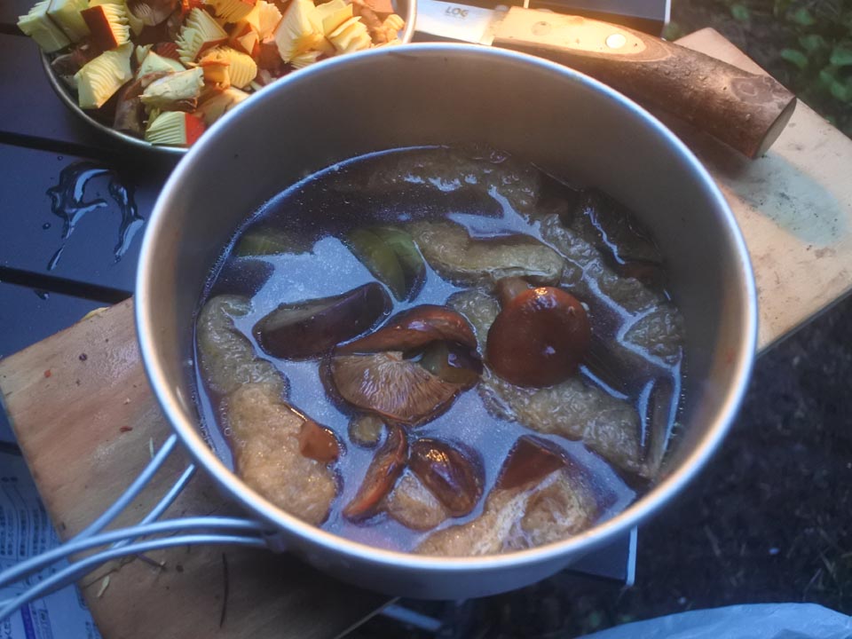 まずは昨日haseさんに買って来てもらったナス・油揚げとチチタケをめんつゆで茹でて・・・・