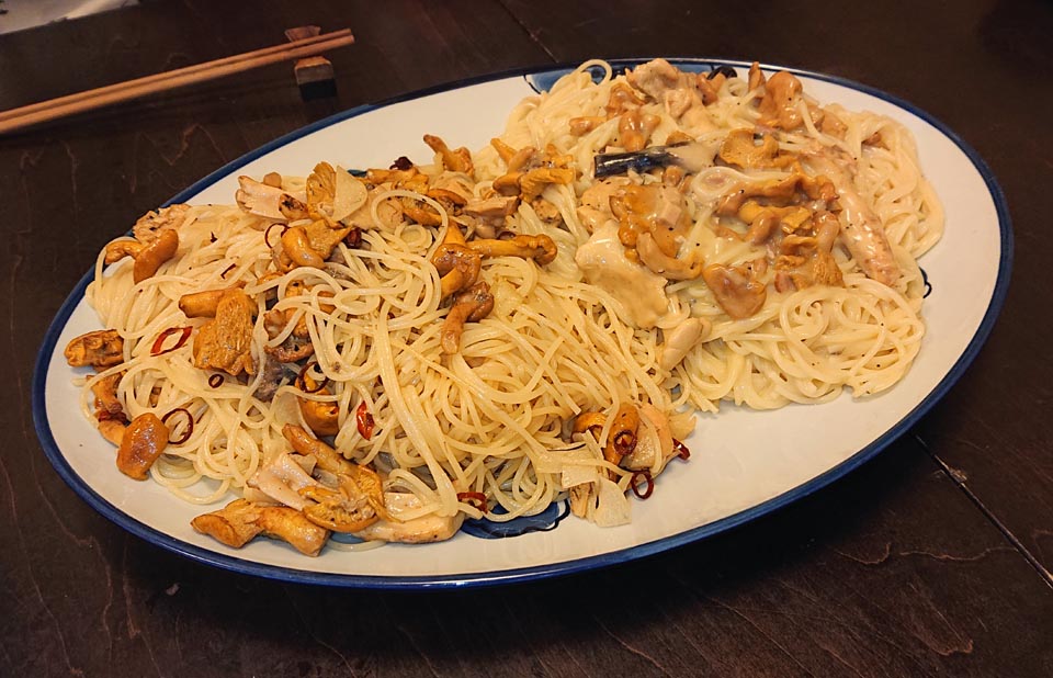 〆はアンズタケ・カノシタ・ムラサキヤマドリタケ(先々週のキープ品)使い、ペペロンチーノとクリームパスタの合盛りパスタ。
