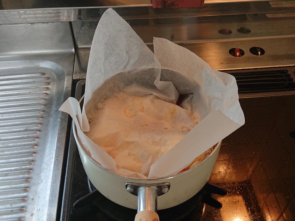 これに醤油・酒・味醂・砂糖(多め)・水400ccを塩梅し、落し蓋・中火で30分煮る。