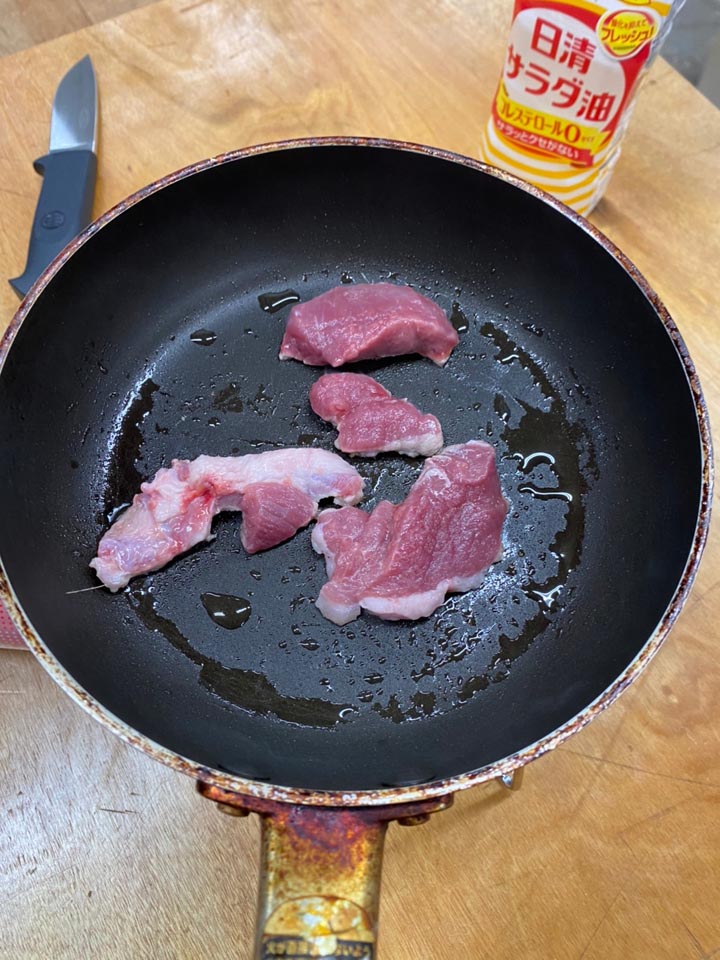 お肉は猪肉100%、ソースはフライパンに残った肉汁にバルサミコ・ケチャップ・オタフクソース・酒を投入し、煮詰める式♪