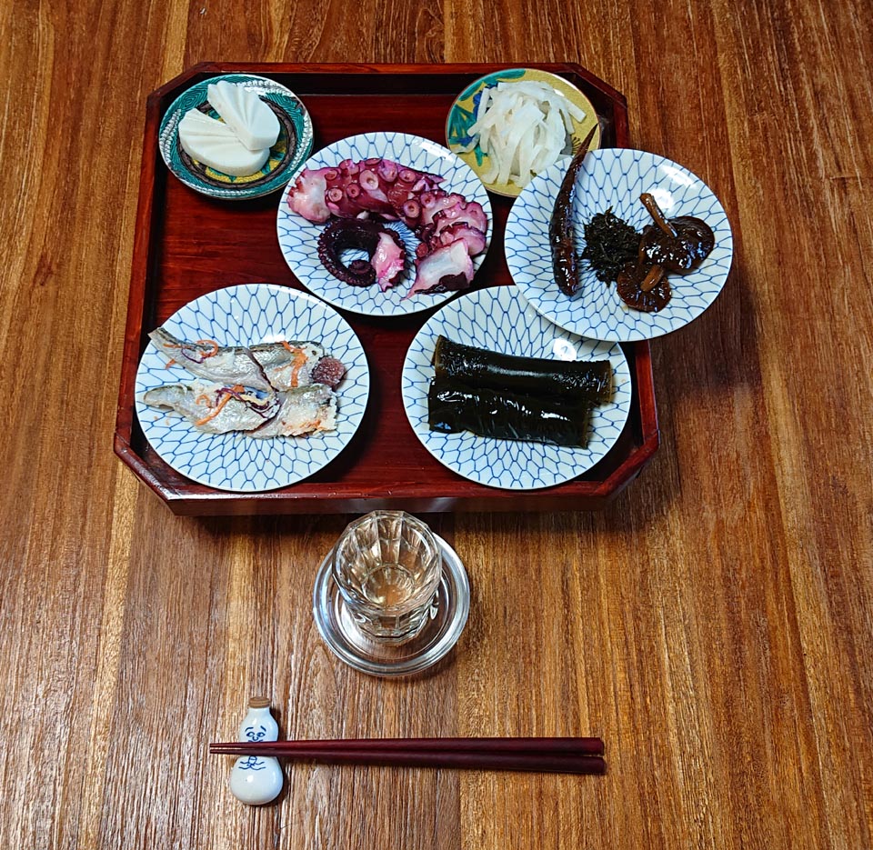 自家製なます・自家製鯊の甘露煮・キンダケと山椒の佃煮・自家製鯊の昆布巻き・秋田名物ハタハタ鮨・自家製江戸前真蛸の酢蛸であります。